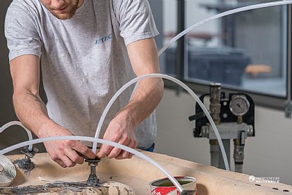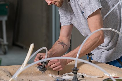 Danach wird die Luft zwischen Folie und Form abgesaugt und über einen zweiten Anschluss ein dünnflüssiges Infusionsharz eingesaugt.