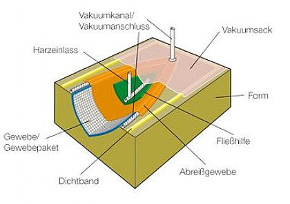 Im Gegensatz zu den anderen Verfahren werden die Fasern bei der Vakuuminfusion trocken in die Form eingelegt und mit Vakuumfolie und Dichtband luftdicht abgeschlossen.